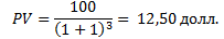 Какова приведенная стоимость 100 долл.. полученных по истечении трех лет, если ставка дисконтирования равняется 100 процентов, 10 процентов, 0 процентов.