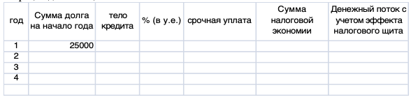 Кредит в размере 25000 тыс. у.е. выдается под сложную ставку ссудного процента 16 % годовых. Кредит должен быть погашен в течение 4 лет ежегодными равными срочными уплатами. Компания платит налог на прибыль по ставке 20%.