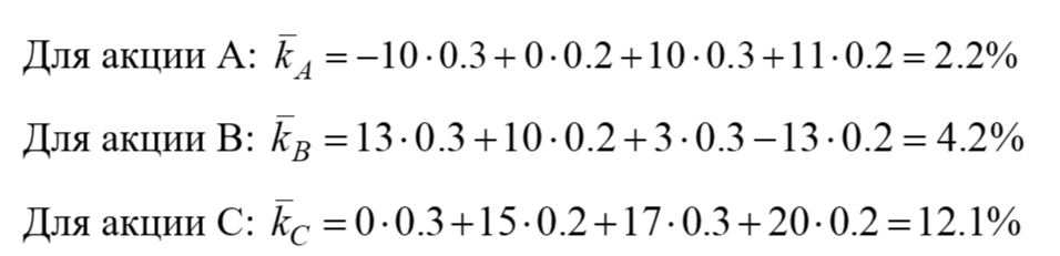 Определите ожидаемую доходность и стандартное отклонение портфеля, если инвестор вкладывает 30% средств в акции А, 50% - в акции В, 20% - в акции С. Предполагается, что доходность каждой ценной бумаги является некоррелированной с доходностью остальных ценных бумаг.