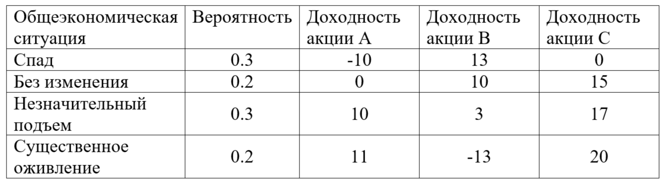 «Инвестор владеет тремя видами акций. Он произвел оценку следующего совместного вероятностного распределения доходностей:»