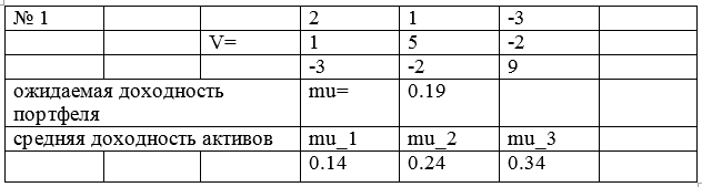 «Найти портфель минимального риска из трёх активов при заданной доходности портфеля mu, если известны средние доходности активов mu_1, mu_2, mu_3 и матрица ковариаций этих активов V.»