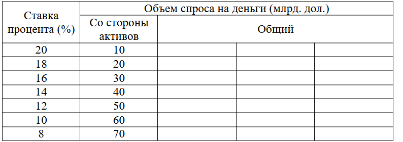 Б) В таблице представлена величина спроса на деньги со стороны активов при различных ставках процента. Используя данные, которые получили при ответе на вопрос А), укажите в таблице общий спрос на деньги.