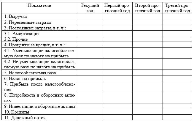 - предполагается привлечение кредитов банка: в начале первого прогнозного года в размере 100 тыс. руб., в начале второго прогнозного года –150 тыс. руб. Погашение основной суммы долга по кредитам будет произведено в конце третьего прогнозного года, уплата процентов (17 % годовых) осуществляется ежегодно. Предельную сумму расходов по процентам, уменьшающим налогооблагаемую базу по налогу на прибыль, определить согласно Налоговому Кодексу РФ.