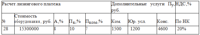 где ЛП общая сумма лизинговых платежей; А величина амортизационных отчислений, причитающихся лизингодателю в текущем году; Пк плата за используемые кредитные ресурсы лизингодателем на приобретение имущества объекта договора лизинга; Пком комиссионное вознаграждение лизингодателю за предоставление имущества по договору лизинга; Пу плата лизингодателю за дополнительные услуги лизингополучателя, предусмотренные договором лизинга; НДС налог на добавленную стоимость, уплачиваемый лизингополучателем за услуги оказанны...