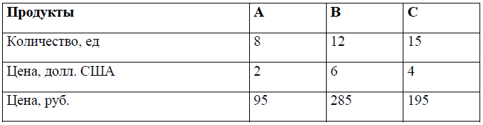«В потребительскую корзину в России и США входят три продукта: А, В, С. Определить паритет покупательной способности доллара по отношению к рублю. На сколько процентов изменился уровень жизни в России по отношению в США?»