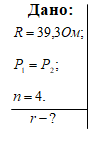 «Батарея аккумуляторов замкнута на сопротивление R=39,3 Ом. Мощность выделяющаяся во внешней цепи, не изменяется, если параллельно сопротивлению R подключить ещё 4 таких же сопротивлений. Найдите внутреннее сопротивление батареи.»