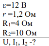 «Батарея с ЭДС 12 В и внутренним сопротивлением r =1,2 Ом питает внешнюю цепь, которая состоит из двух параллельно соединённых ламп сопротивлением 4 Ом и 10 Ом. Определить разность потенциалов на зажимах батареи и токи в лампах.»
