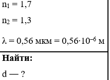 Для уменьшения потерь света при отражении от стекла на поверхность объектива (показатель преломления равен 1,7) нанесена тонкая прозрачная пленка (показатель преломления равен 1,3). При какой наименьшей ее толщине произойдет максимальное ослабление отраженного света, длина волны которого 0,56 мкм приходится на среднюю часть видимого спектра? Считать, что лучи падают нормально к поверхности объектива.