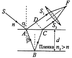 Из световой волны, падающей на пленку, выделим узкий пучок SA. В точках А и В падающий пучок частично отражается и частично преломляется. Отраженные пучки света AS1 и BC...
