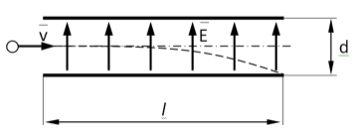 Вдоль пластин на электрон не действуют силы. Продольная скорость не изменяется и остается равной v. Расстояние l элек...