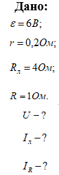К аккумулятору с ЭДС 6В и внутренним сопротивлением 0,2Ом присоединены параллельно друг другу лампочка сопротивлением 4Ом и резистор сопротивлением 1Ом. Найти напряжение на зажимах аккумулятора и силу тока, протекающую через лампочку и резистор.