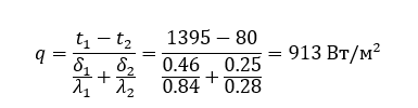 Определяем плотность теплового потока через многослойную стенку по формуле: