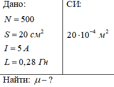 «Катушка с железным сердечником имеет площадь поперечного сечения и число витков 500. Индуктивность катушки с сердечником при силе тока через обмотку . Найти магнитную проницаемость железного сердечника в этих условиях.»