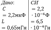 «Определить период и частоту собственных колебаний в контуре при емкости конденсатора 2,2 мкФ и индуктивности катушки 0,65 мГн.»