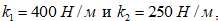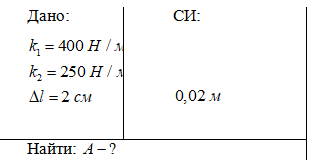 «Определить работу растяжения двух соединенных последовательно пружин жесткостями 400 Н/м и 250 Н/м, если первая пружина при этом растянулась на 2 см.»