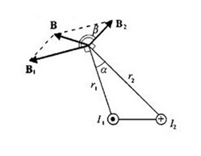 По двум длинным параллельным проводникам текут в противоположных направлениях токи 1 А и 2 А. Расстояние между проводниками 10 см. Определить напряжённость магнитного поля в точке, отстоящей от первого провода на 15 см и от второго на 10 см