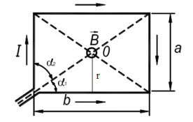«По проводнику, согнутому в виде прямоугольника со сторонами а=8 см и b=12 см, течет ток силой I=50 А. Определить напряженность Н и индукцию В магнитного поля в точке пересечения диагоналей прямоугольника.»