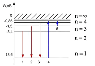 2. На рисунке представлена диаграмма энергетических уровней атома водорода. Поглощение фотона с наибольшей длиной волны происходит при переходе, обозначенном стрелкой под номером …?