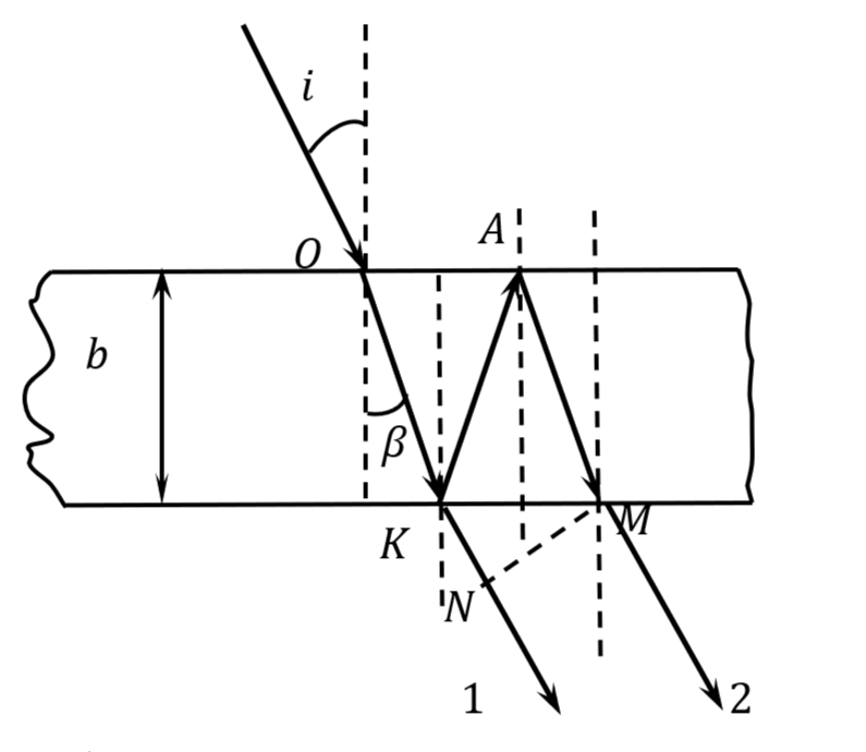 Рассмотрим ход лучей в пленке. Оптическая разница хода лучей 1 і 2 составляет: