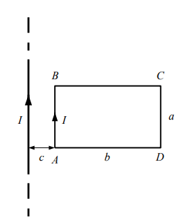 Прямоугольная проволочная рамка со сторонами a = 10 см и b = 20 см расположена в одной плоскости с длинным прямым проводом так, что две ее короткие стороны параллельны проводу. По рамке и проводу текут одинаковые токи I = 100 А. Определите силу, действующую на рамку, если ближайшая к проводу сторона рамки находится на расстоянии с= 5 см (рис. 2.20).