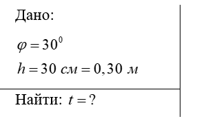 С наклонной плоскости, составляющей угол с горизонтом скатывается без скольжения шар. Пренебрегая трением, определить время движения шара по наклонной плоскости, если известно, что его центр масс при скатывании понизился на 30 см.