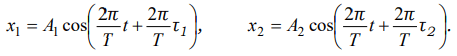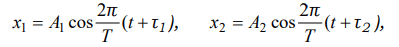 Складываются два колебания одинакового направления где А1 = 3 см, А2 = 2 см, τ1= 1/6 c, τ2 = 1/3 с, Т =2 с. Построить векторную диаграмму сложения этих колебаний и написать уравнение результирующего колебания