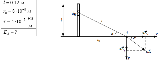 «Тонкий стержень длиной 12 см заряжен с линейно плотностью 400 нКл/м. Найти напряженность электрического поля в точке, расположенной на перпендикуляре к стержню, проведенному через один из его концов на расстоянии 8 см.»