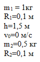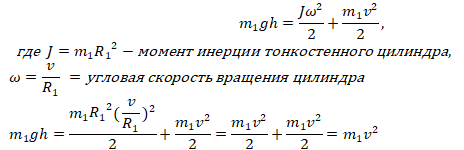 «Тонкостенный цилиндр массой 1 кг и радиусом 0,1 м находится на вершине пологой горки высотой 1,5 м. Цилиндр без начальной скорости скатывается с горки и на горизонтальном участке пути сталкивается с лежащим тонкостенным цилиндром»