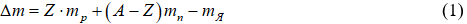 Дефект массы атомного ядра представляет собой разность массы нуклонов (протонов и нейтронов), составляющих ядро, и массы ядра атома и определяется по формуле: