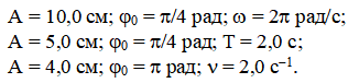«Записать уравнение гармонических колебаний при следующих значениях параметров: А = 10,0 см; 0 = /4 рад; = 2 рад/с; А = 5,0 см; 0 = /4 рад; Т = 2,0 с;»