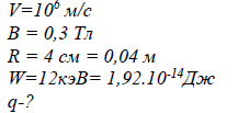 «Заряженная частица движется в магнитном поле по окружности со скоростью V = 10^6 м/с. Индукция магнитного поля В =0,3 Тл. Радиус окружности R = 4 см. Найти заряд q частицы, если известно, что ее энергия W=12 кэВ.»