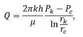При плоскорадиальном движении в однородном пласте несжимаемой жидкости по линейному закону фильтрации Дарси объемный расход равен