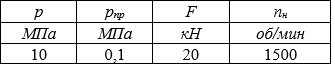 Гидроцилиндр 2 с двусторонним штоком одинакового диаметра (d1, d2) при давлении масла в рабочей полости р и противодавлении в сливной полости рпр развивает тяговое усилие F. Уплотнение поршня и штока в гидроцилиндре манжетное. Насос 4 при вращении собственного приводного вала с частотой пн развивает подачу QH = 8 л/мин = 0,000133 м3/ с. Определить пределы регулирования скорости движения поршня гидроцилиндра при изменении скорости вращения приводного вала насоса 4 от 1000 до 2000 об/мин.