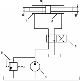 «Гидроцилиндр 2 с двусторонним штоком одинакового диаметра (d1, d2) при давлении масла в рабочей полости р и противодавлении в сливной полости рпр развивает тяговое усилие F. Уплотнение поршня и штока в гидроцилиндре манжетное.»