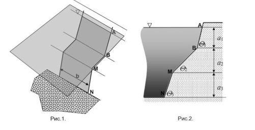 На рисунках 1 и 2 показаны расчетные схемы задания. На них изображены плоские поверхности ABMN, находящиеся под давлением воды слева. Ширина стенок и затворов равна b. Пользуясь расчетной схемой и исходными данными вариантов необходимо: