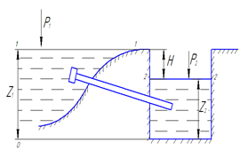 Запишем уравнение Бернулли для сечений 1-1 и 2-2 относительно плоскости 0-0: