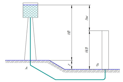 Назначить диаметр трубопровода D и определить необходимую высоту водонапорной башни Нб в точке А (см. рис. 1) для обеспечения расчетной подачи воды с расходом Q=83 л/с (8,3х10-2м3/с) потребителю в точке В по трубопроводу длинной L=600м, при разности отметок земли в точках А и В z=10м и минимальном свободном напоре в точке В Нсв=18м.