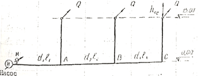 От насоса вода по трем последовательно соединенным трубам поступает в водоразборные пункты А, В и С на отметку 15 м. Расходы всех: пунктов равны Q = 8 л/с. Определить показание манометра в начале системы, а также остаточные напоры у потребителей А и В. Потребителю С следует обеспечить остаточный напор h0C = 10 м. Трубы водопроводные, нормальные. Местные потери напора принять равными 10% от потерь по длине. Диаметры и длины участков труб: d1 = 200 мм, l1 = 500 м; d2 = 150 мм, l2 = 400 м; d3 = 100 мм, l3 = 300 м.