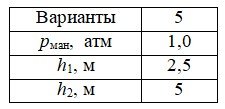= 1000 кг/м3) давление, показываемое манометром рман, а уровни жидкости h1 и h2.