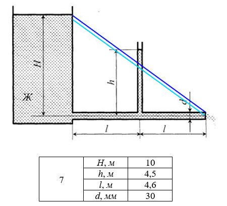 При истечении воды из резервуара в атмосферу по горизонтальной трубе диаметром d и длиной l уровень в пьезометре, установленном посередине длины трубы, равен h. Определить расход Q и коэффициент гидравлического трения трубы l, если статический напор в баке постоянен и равен Н. Построить пьезометрическую и напорную линии. Сопротивлением входа в трубу пренебречь.