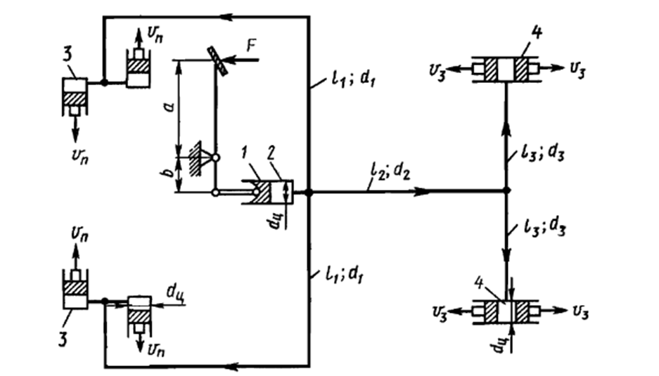 В гидротормозной системе автомобиля передача усилия F от ножной педали к тормозам колёс производится посредством жидкости, вытесняемой поршнем 1 из главного тормозного цилиндра 2 по трубопроводам в рабочие тормозные цилиндры передних 3 и задних 4 колёс. На первом этапе торможения за счёт хода поршней рабочих цилиндров выбирается зазор между тормозными колодками и барабанами. На втором этапе торможения происходит сжатие всего объёма жидкости V в системе, выравнивание давления и прижатие колодок к барабанам. Диаметры всех цилиндров одинаковы. Определить: 1) скорости перемещения поршней колёсных тормозных цилиндров для передних (υп) и эадних (υз); 2) ход педали, необходимый для упругого сжатия тормозной жидкости в системе. Плотность жидкости 𝜌 , модуль объёмной упругости 1/𝛽р, жидкость – минеральное масло, вязкостью 𝜈.
