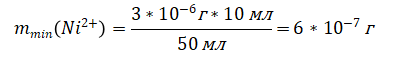 Чувствительность колориметрического определения никеля с помощью диметилглиоксима в определенных условиях равна 3 мкг в 50,00 мл раствора, то минимальная масса ионов никеля для его определения в 10 мл раствора составит: