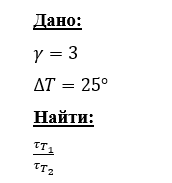 Зависимость скорости химической реакции от температуры выражается законом Вант-Гоффа. Т.к. происходит увеличение температуры реакции, то время протекания реакции обратно пропорционально скорости реакции. В законе Вант-Гоффа используем вместо скорости время: