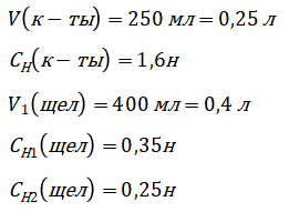 «К 250 мл 1,6 н раствора кислоты добавили 400 мл 0,35 н раствора щелочи. Какой объем 0,25 н раствора другой щелочи дополнительно потребуется для нейтрализации кислоты?»