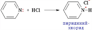 «Как реагирует пиридин: а) с хлористым водородом, б) с хлористым метилом, в) гидроксидом натрия? а) с хлористым водородом - путем пропускания хлористого водорода в пиридине, растворенном в диэтиловом эфире получаем хлорид пиридиния;»