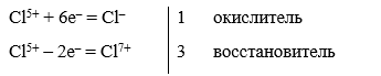 Степень окисления меняет атом хлора. Следовательно, реакция окислительно-восстановительная. Реакция диспропорционирования, так как происходит одновременное понижение и повышение степени окисления атомов одного и того же элемента Cl5+.