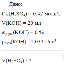 «Какой объем раствора серной кислоты с молярной концентрацией 0,42 моль/л потребуется для нейтрализации 20 мл раствора гидроксида калия с массовой долей растворенного вещества 6 %»