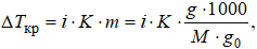 Понижение температуры DТкр кристаллизации растворов электролитов в воде вычисляется по формуле