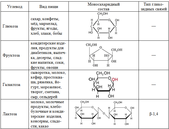 1. На основании соответствующих разделов учебника составьте таблицу об углеводах пищи растительного и животного происхождения по типу (в графе «Моносахаридный состав» для моно- и дисахаров приведите структурные формулы соответствующих соединений, для полисахаров приведите фрагмент структуры из трёх моносахаридных остатков).