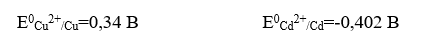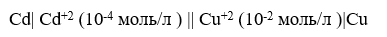 Кадмий имеет стандартный электродный потенциал равный -0,402 В. Он меньше, чем стандартный электродный потенциал меди, поэтому кадмий выступает в роли анода, а медь в роли катода.